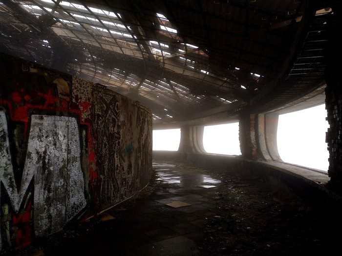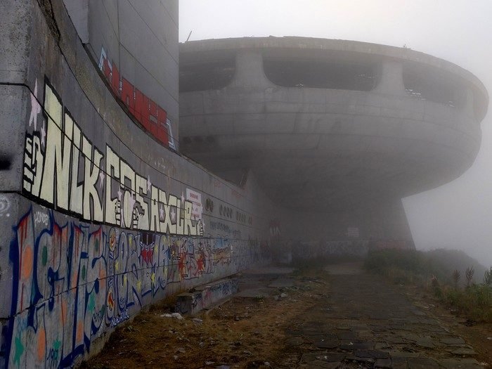Un complejo que se halla en un estado total de abandono que ya se percibe en la solitaria carretera de acceso, con varios baches a sortear, y que sin embargo conduce sin problemas hasta la cima de la montaña donde se erige el conocido como ‘OVNI de Bulgaria’. Aquí el único habitante es un silencio sepulcral –que a ratos se rompe por las fuertes rachas de viento– acompañado de una densa capa de niebla que crean una atmósfera fantasmagórica y única que te invitan a adentrarte en su interior.