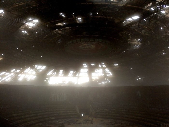 Esta sala diáfana de proporciones titánicas acogió en su día –bajo la inmensa cúpula con el símbolo de la hoz y el martillo y la inscripción ‘Proletariado del mundo, ¡uníos!’– las reuniones del Partido Comunista de Bulgaria en unas bancadas que todavía hoy se mantienen, aunque en un estado lamentable, entre restos de ruinas. Sus imponentes dimensiones abducen y transmiten esa sensación presente en otras construcciones soviéticas: te hacen sentir minúsculo ante tal grandiosidad. Con ello pretenden plasmar ese ideal comunista del poder de la colectividad frente al individualismo.