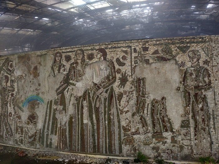 Después de superar una primera sala llena de escombros y varios pasillos sin iluminación nos dirigimos, cual arqueólogos en el interior de una pirámide, en busca de la sala principal, el Auditorio. En este amplio espacio ovalado se hace evidente el contraste entre el brutalismo arquitectónico exterior con un interior ricamente decorado: algo más de 500 metros cuadrados de murales y mosaicos que llevaron a cabo más de 60 artistas del país y que conmemoran la historia del movimiento comunista en Bulgaria. Todo ello con una clara inspiración soviética que, a pesar de la vandalización, todavía se respira entre sus muros.