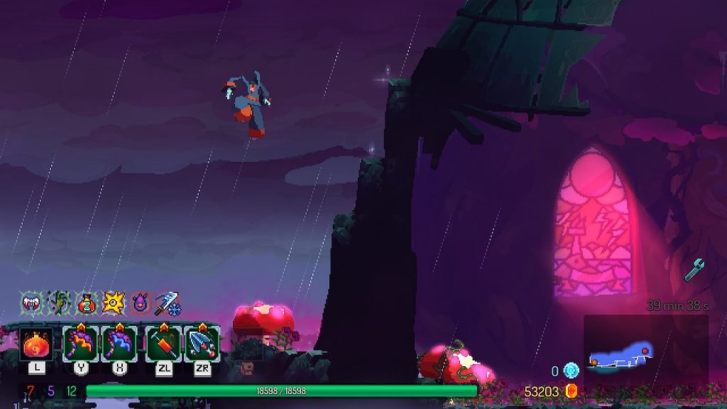 En este nuevo bioma, Motion Twin ha hecho un gran esfuerzo en lograr una sensación de peligro y desasosiego constante. Los fondos amedrentan, llenando la zona de enormes estatuas de piedra, monumentos flotantes y un aire lleno de peligro y misticismo. La música, como siempre a la altura, espoleándonos a ir cada vez más rápido… y cometer errores.